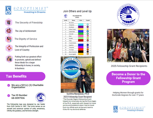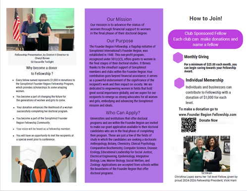 Founder Region Fellowship seeks to support women who are working in fields traditionally held by men or fields that have great social importance to the world. The recipients’ work will reflect and further Soroptimist ideals.