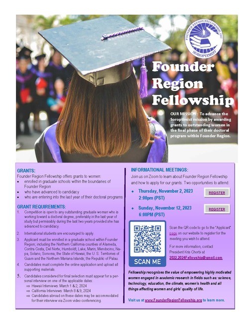 Founder Region Fellowship is a non-profit organization that advances the Soroptimist mission by awarding grants to outstanding women in the final phase of their doctoral program within Founder Region. Fellowship recognizes the value of empowering highly motivated women engaged in academic research in fields such as: science, technology, education, the climate, women's health and all things affecting women and girls' quality of life.