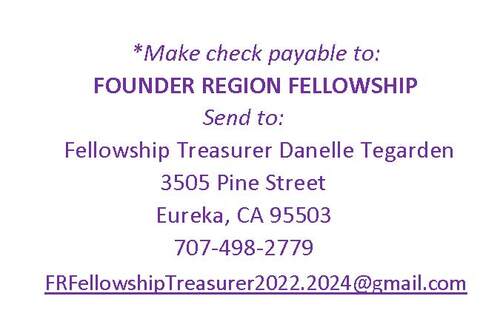 If paying by check, send directly to Danelle Tegarden, Fellowship Treasurer, 3505 Pine Street, Eureka, CA 95503.