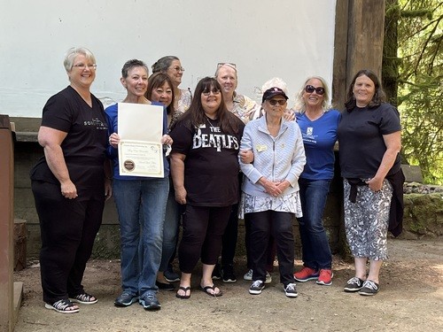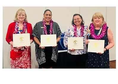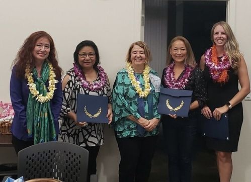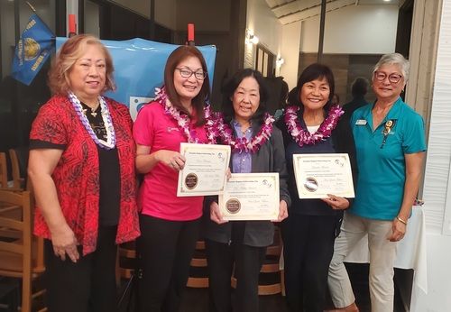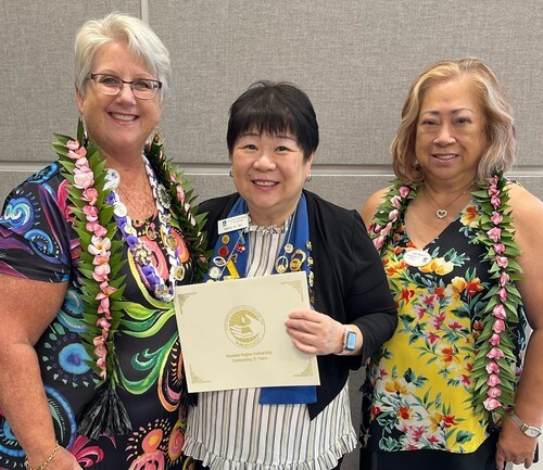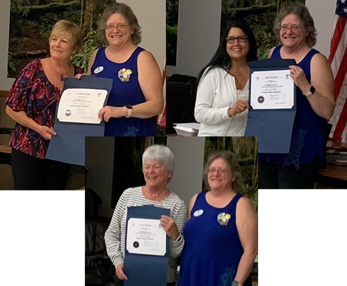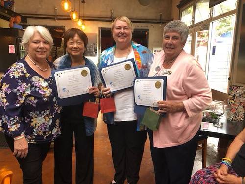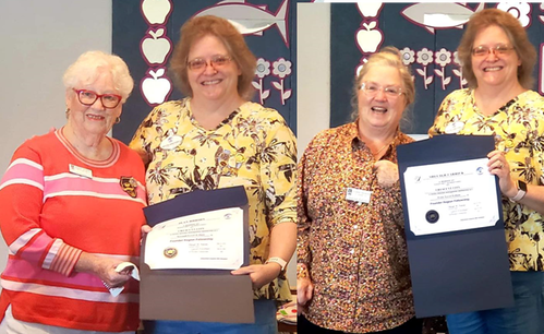 Director Kay Kelley is surprised with her 4th Level at the District 5 meeting, awarded by Fellowship chair Vicki and director Cindy.
